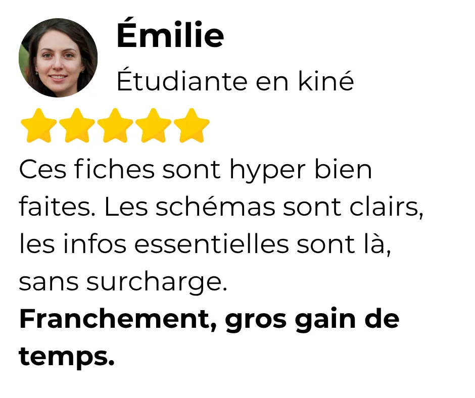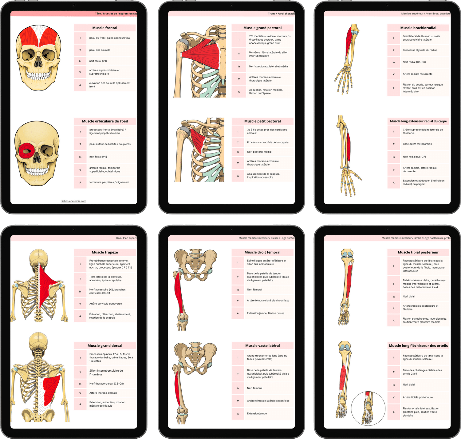 Tu retiens mieux avec une vision d’ensemble ? Chaque fiche contient un ou plusieurs tableaux ultra lisibles (origine, insertion, innervation, fonction…) pour que tu puisses mémoriser les infos clés sans surcharge mentale.